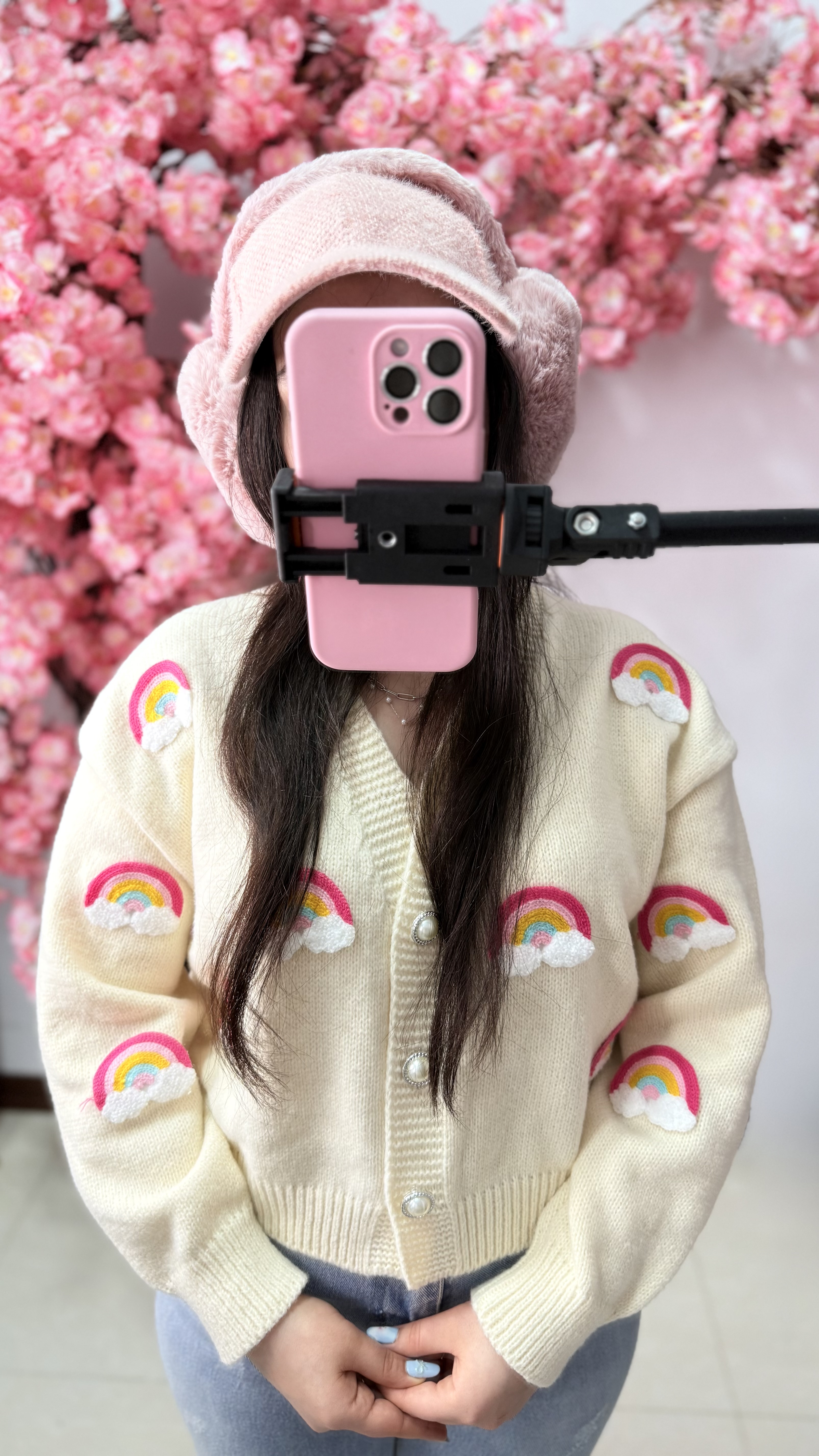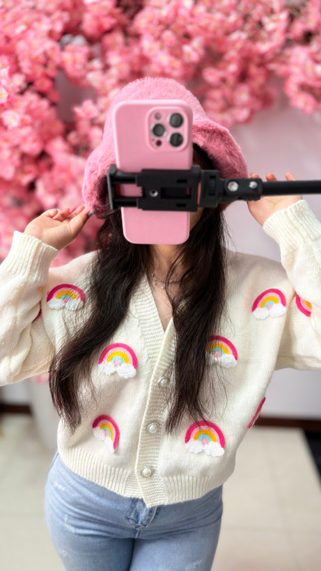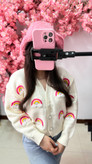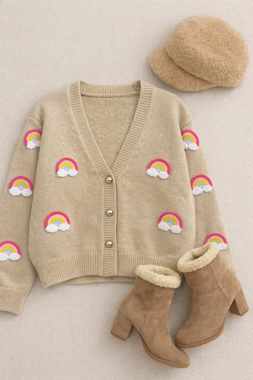 کاردیگن بافت رنگین کمانی با طراحی خاص و اپلیکههای برجسته ابر، بافت نرم و تنخور شیکه. انتخابی گرم و کاربردی برای استایلهای پاییزی و زمستانی که بهراحتی با بوت و اکسسوریهای زمستانه ست میشه