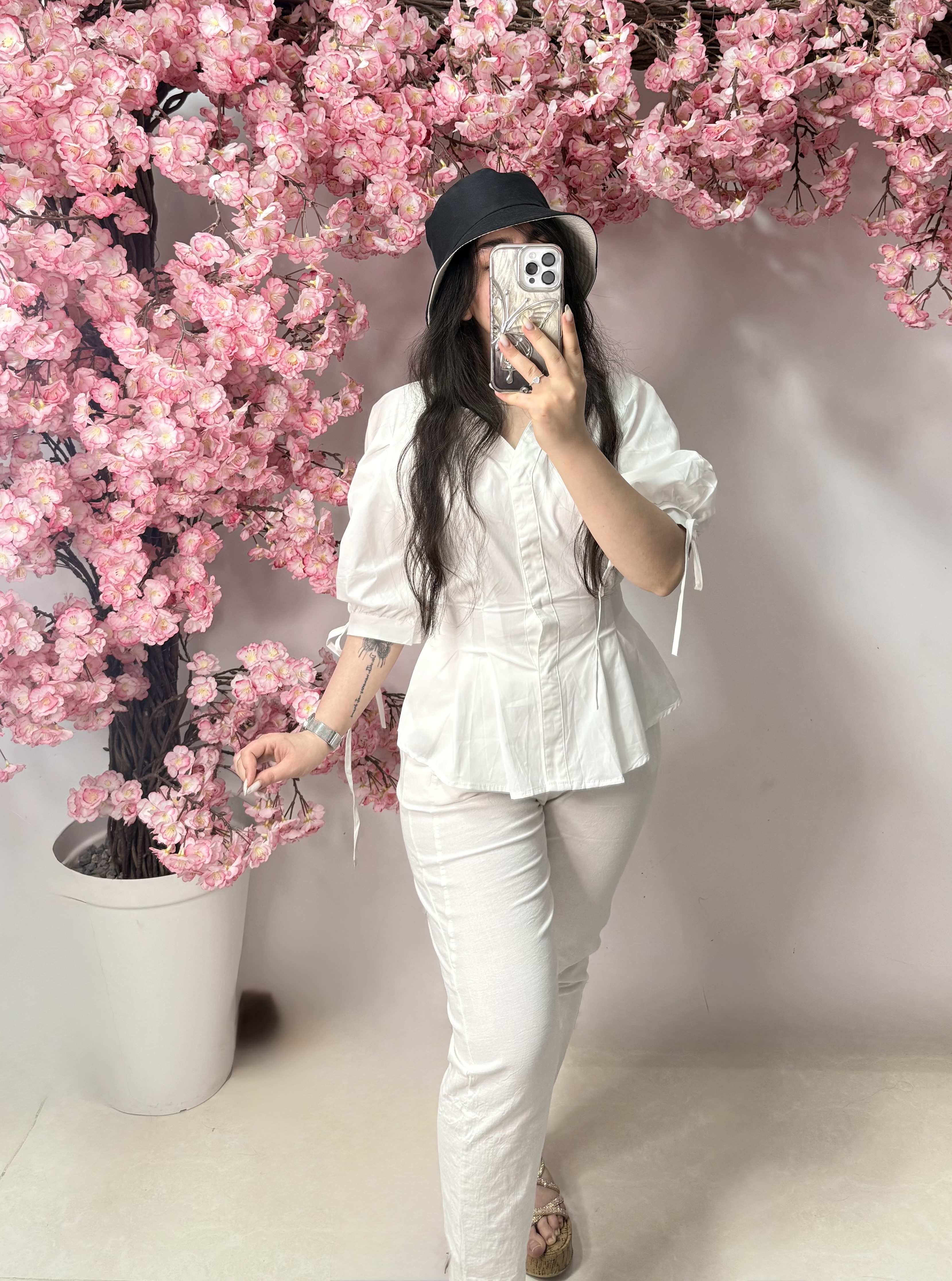 شومیز کراپ زنانه و دخترانه کلاسیک وارداتی جلو بندی آستین پفکی
